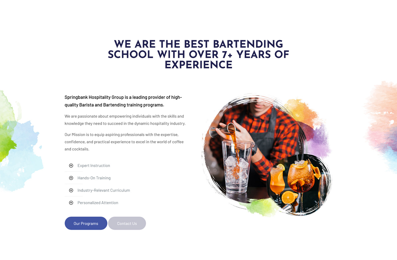 SPRINGBANK HOSPITALITY GROUP IS A LEADING PROVIDER OF HIGH-QUALITY BARISTA AND BARTENDING TRAINING PROGRAMS. WE ARE PASSIONATE ABOUT EMPOWERING INDIVIDUALS WITH THE SKILLS AND KNOWLEDGE THEY NEED TO SUCCEED IN THE DYNAMIC HOSPITALITY INDUSTRY. OUR MISSION IS TO EQUIP ASPIRING PROFESSIONALS WITH THE EXPERTISE, CONFIDENCE, AND PRACTICAL EXPERIENCE TO EXCEL IN THE WORLD OF COFFEE AND COCKTAILS.